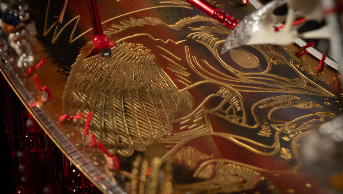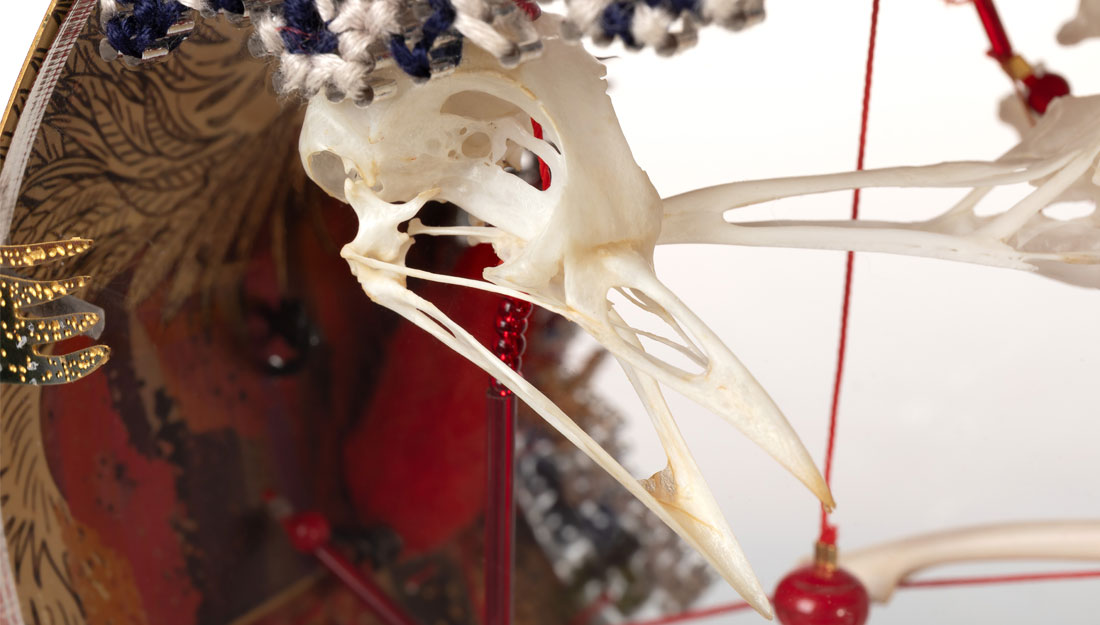 Hand printed and etched steel, carved lime wood, found objects, natural ephemera and bird skeletons found along the wayside.