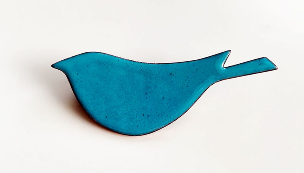 Copper outlines, designed by the members, are wire cut in Birmingham’s famous jewellery quarter and finished with enamel and silver fixings in Shelanu’s workshop. Block enamel colours in contemporary pastel hues, make bold statements on brooches or a lighter touch on earrings and pendants.