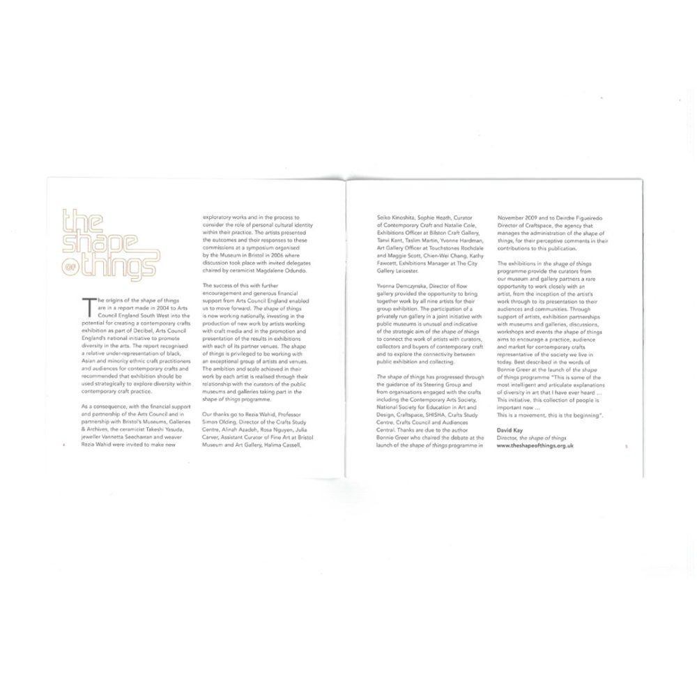 The shape of things is a national initiative developing over several years. Through a series of exhibitions and professional events it seeks to explore the distinctive contribution artists working in craft media are making to influence or reflect national identity, the intercultural nature of British society and its connection with global cultures.