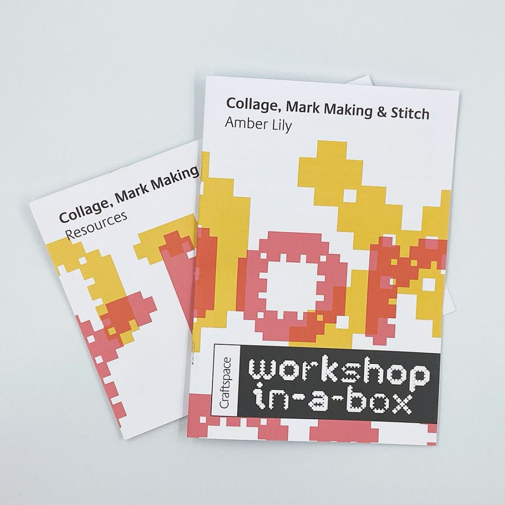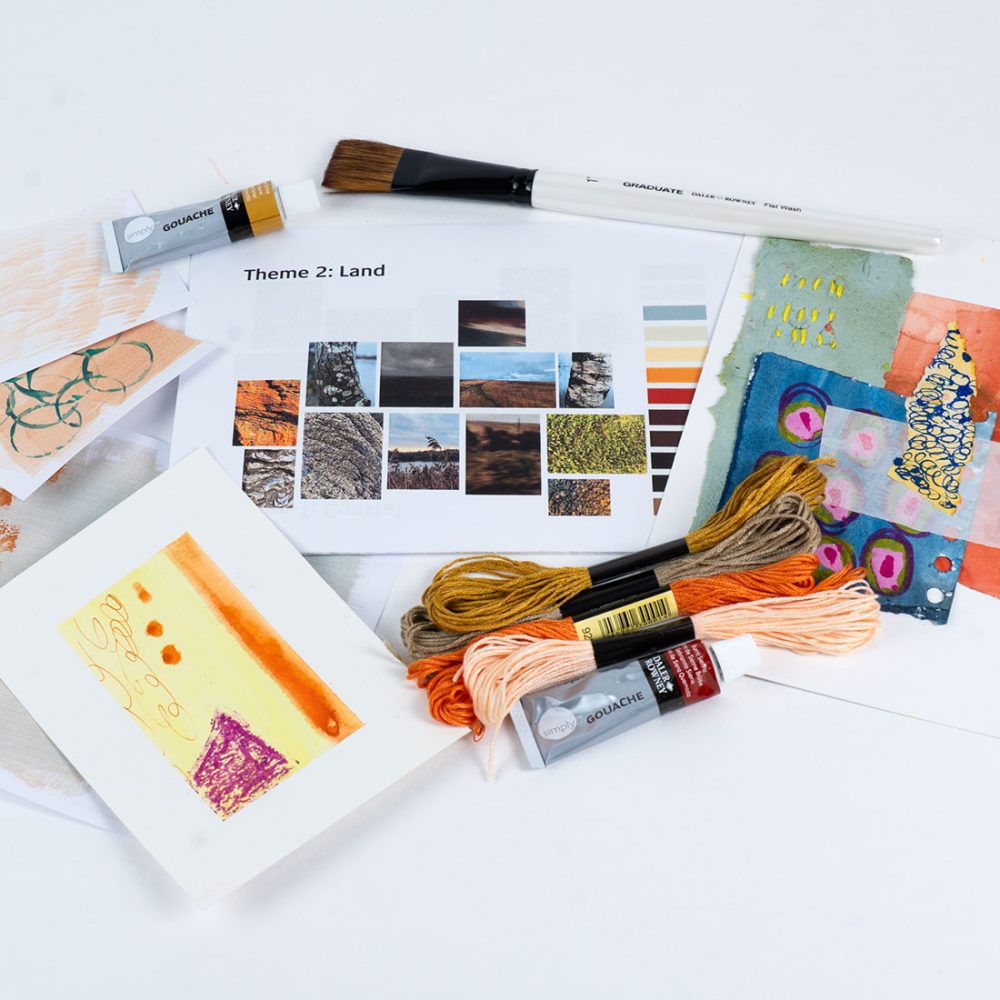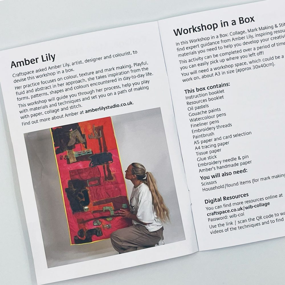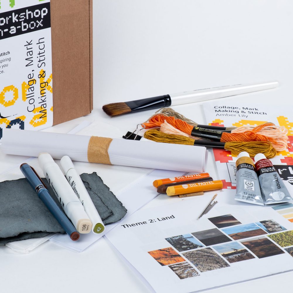 Each Collage, Mark-Making and Stitch box contains an embroidery needle, 3 pins, a fineliner, 2 gouache paints, 3 oil pastels, 2 aquamarkers, 4 skeins of embroidery thread, Amber’s handmade paper, paper, card, tissue paper, tracing paper, a paintbrush and a glue stick, as well as an instruction booklet and a resource booklet.