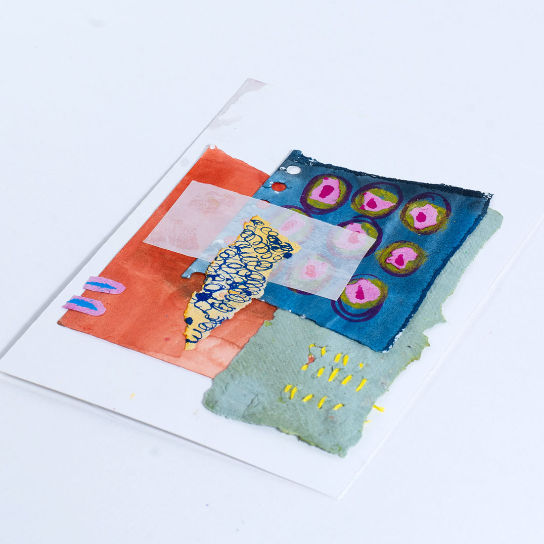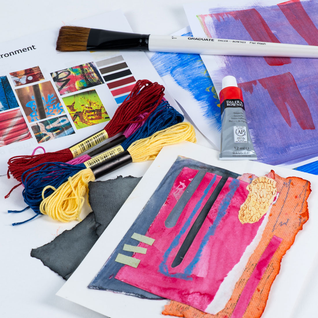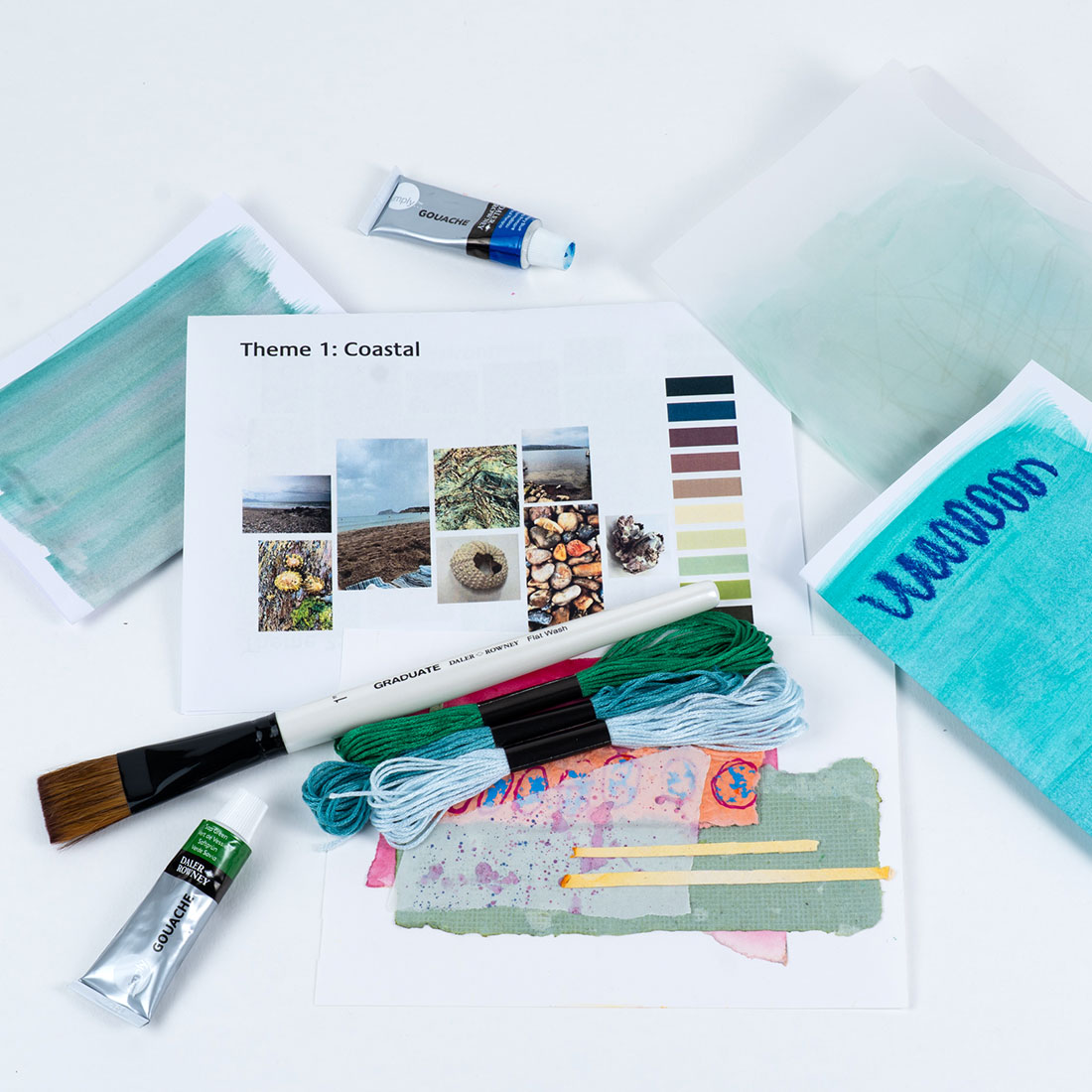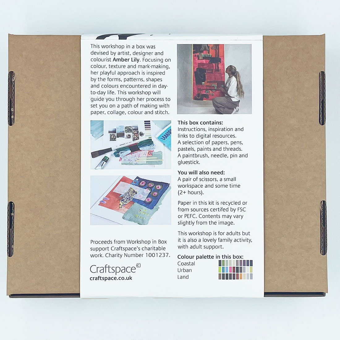 Each Collage, Mark-Making and Stitch box contains an embroidery needle, 3 pins, a fineliner, 2 gouache paints, 3 oil pastels, 2 aquamarkers, 4 skeins of embroidery thread, Amber’s handmade paper, paper, card, tissue paper, tracing paper, a paintbrush and a glue stick, as well as an instruction booklet and a resource booklet.