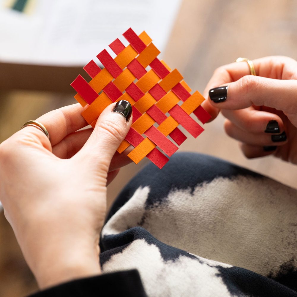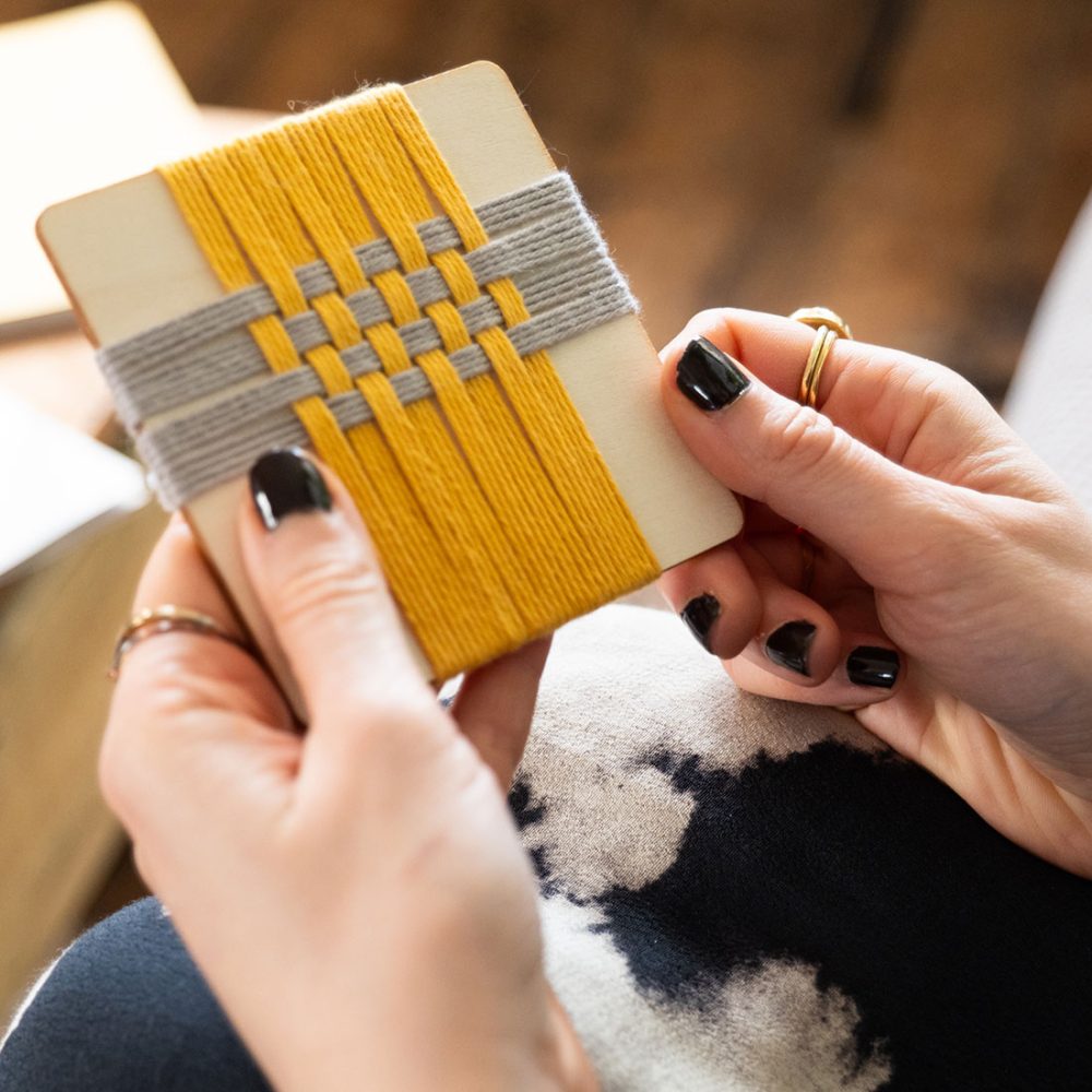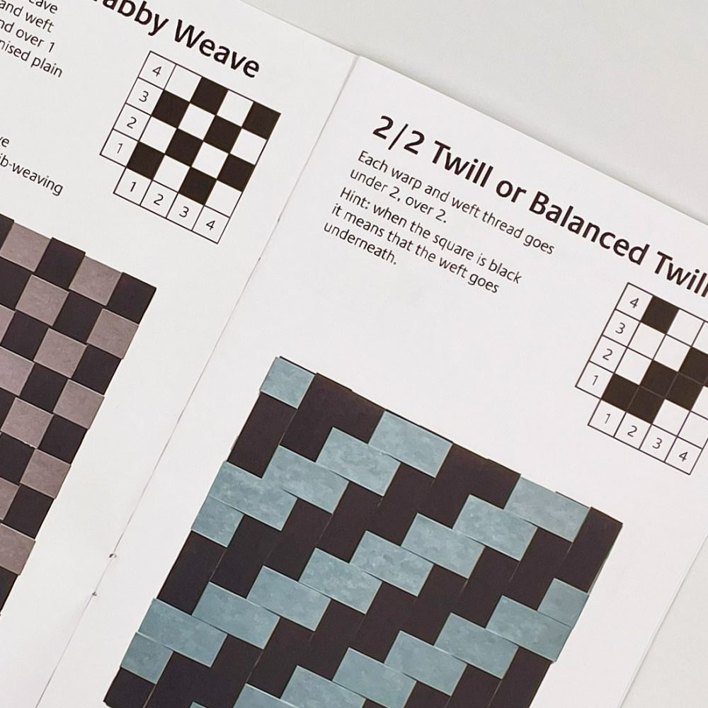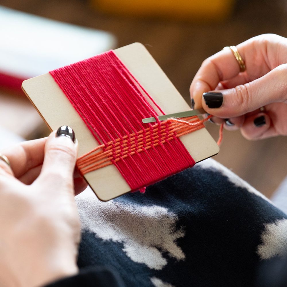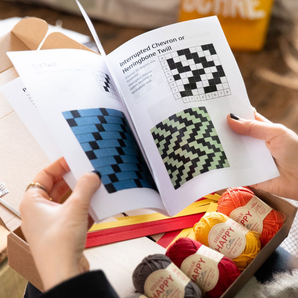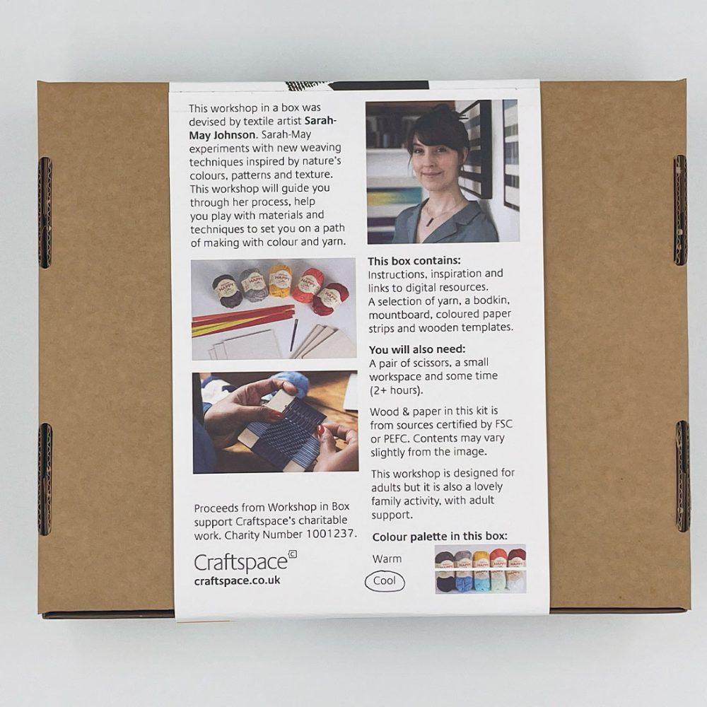 Each Off-Loom Weaving box contains 5 balls of yarn, 2 pieces of mountboard, 3 FSC-approved wooden squares, strips of coloured paper to test out different weaving patterns and a bodkin needle, as well as an instruction booklet and a resource booklet.