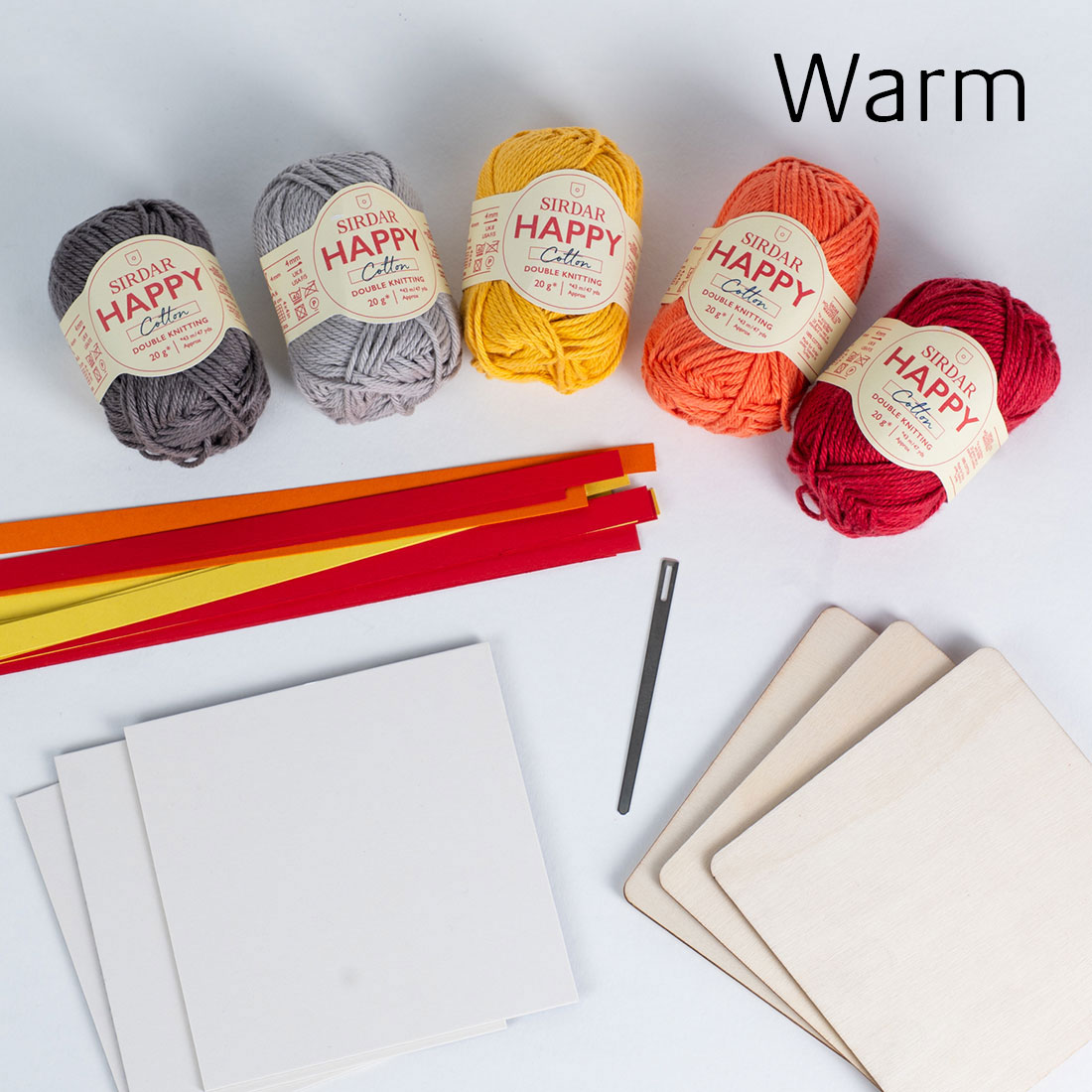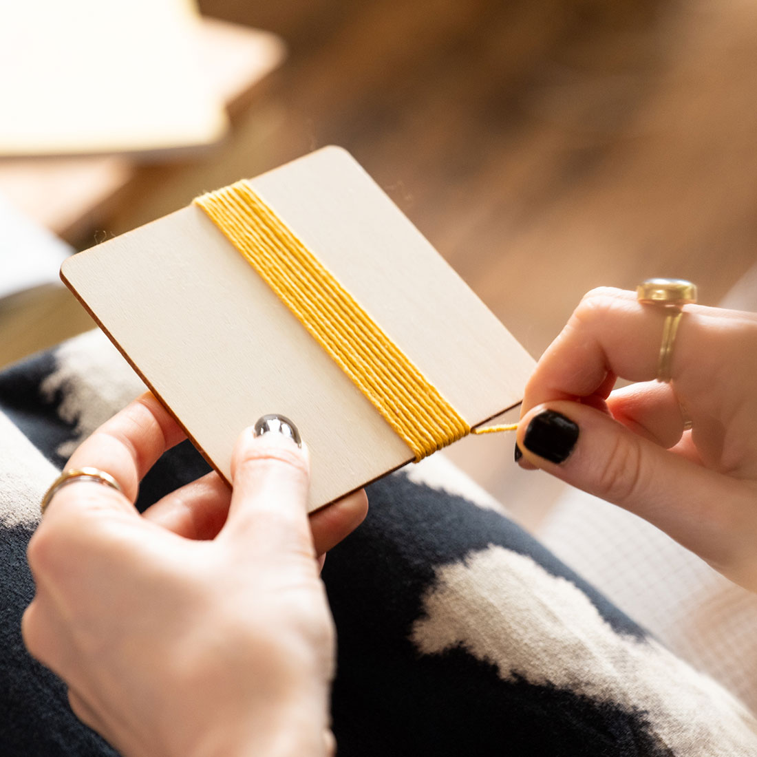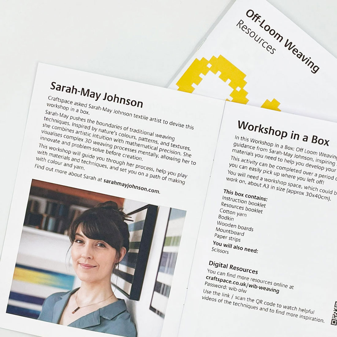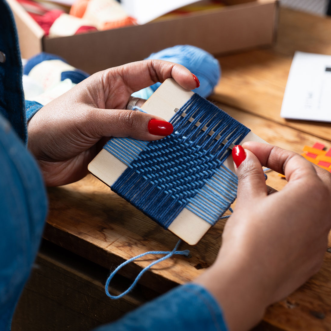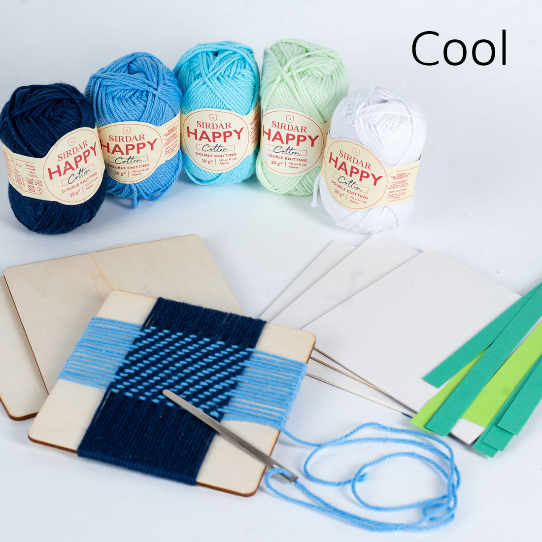 Each Off-Loom Weaving box contains 5 balls of yarn, 2 pieces of mountboard, 3 FSC-approved wooden squares, strips of coloured paper to test out different weaving patterns and a bodkin needle, as well as an instruction booklet and a resource booklet.