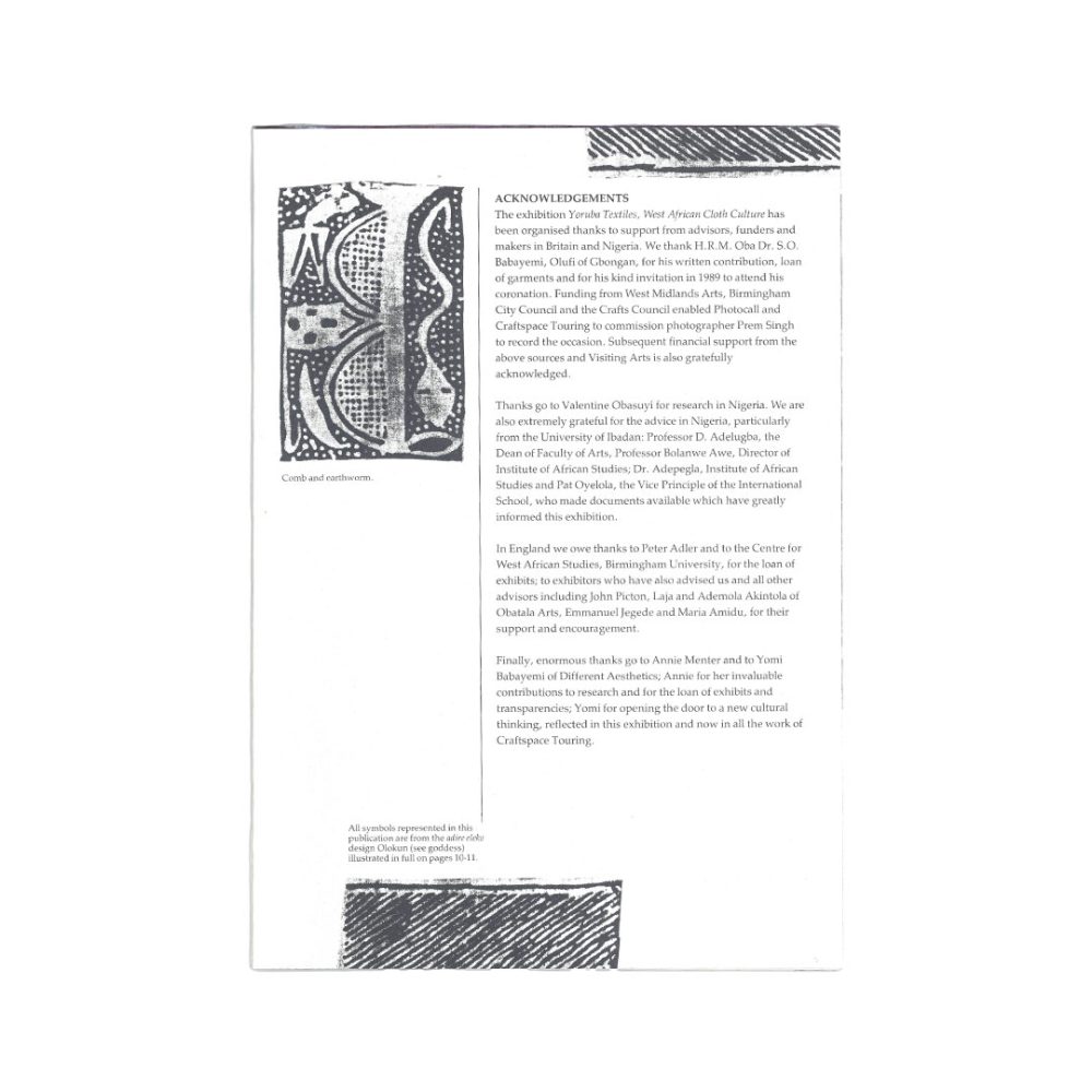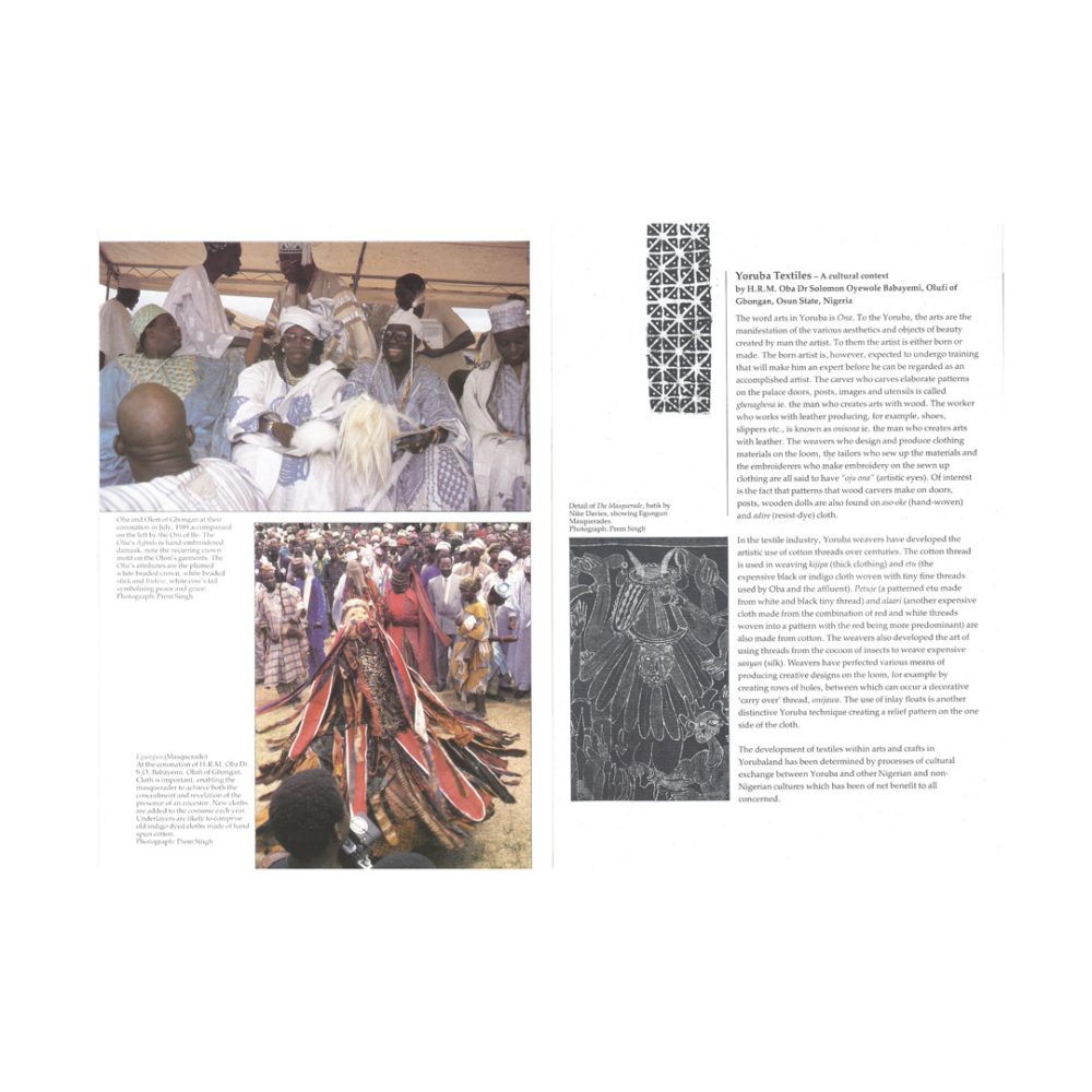 Yoruba Textiles: West African Cloth Culture (1992) was an exhibition which explored the complexity and virtuosity of Yoruba textiles.